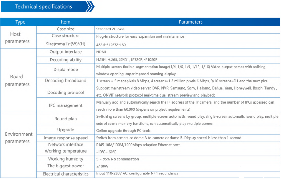 The Network multi-screen image processing system is a high-definition digital decoding matrix integrated management platform independently developed and produced. The front end (network camera ICP, NVR, PC, etc.) enters the monitoring center through a network transmission system such as optical fiber. Then uniformly manage, decode, display, and splice video wall in full screen, split it in multi screen, superimposed roaming. Applicable to video stream coding security monitoring, decoding access, output preview, flexible picture combination, Fast switching, timing round patrolet, diverse plan.